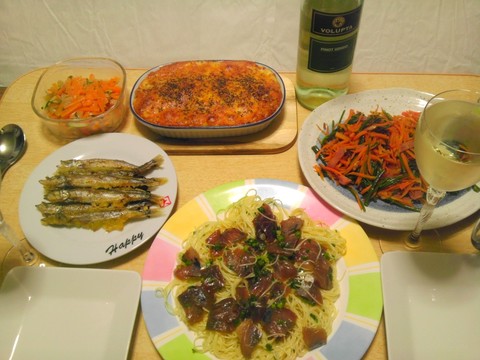 本日のメニューは、上段左から中華クラゲサラダの残り、卯の花グラタン、にんじんと空芯菜のニンニク炒め、下段左からししゃものソテー、アジのヅケの冷製パスタ、です。
