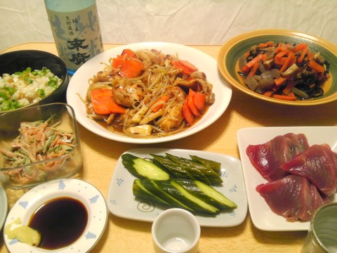 鶏肉のモヤシにんじんエリンギ炒め、他 本日のメニューは、上段左からオクラとぬか漬け長芋のなめ茸和え、鶏肉のモヤシにんじんエリンギ炒め、ヒジキの煮物、下段左からにんじんとゴボウのゴマサラダ、キュウリのぬか漬け、カツオの刺身、です。