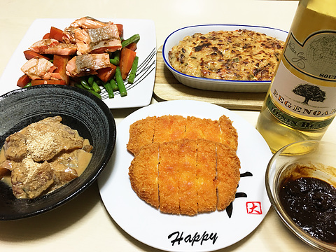 本日のメニューは、上段左からサーモンとにんじんとインゲンのソテー&バルサミコソースがけ、ドリア、下段左からカンパチのごま漬け、味噌カツ、です。