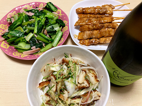本日のメニューは、上段左からハムと小松菜のバター炒め、焼き鳥、下段が新玉ねぎのフライ和え、です。
