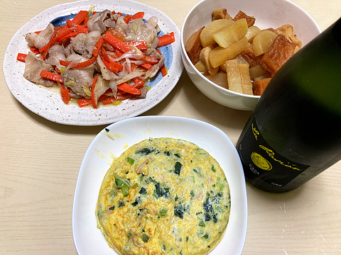 本日のメニューは、上段左から豚バラとにんじんの塩炒め、さつま揚げとちくわと大根の煮物、下段がしらすと小松菜の玉子焼き、です。