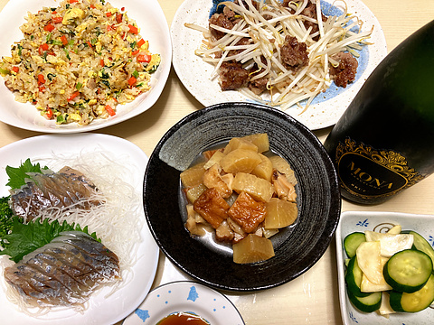 本日のメニューは、上段左から残り物チャーハン、豚皮入り肉団子のもやし炒め、下段左からアジの刺身、さつま揚げとちくわと大根の煮物、カブときゅうりの牡蠣しょう油浅漬け、です。