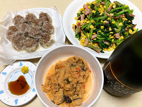 本日のメニューは、上段左から豚皮入りシューマイ、ベーコンとほうれん草とコーンのバターたまりしょう油炒め、下段がキムチチーズおから、です。