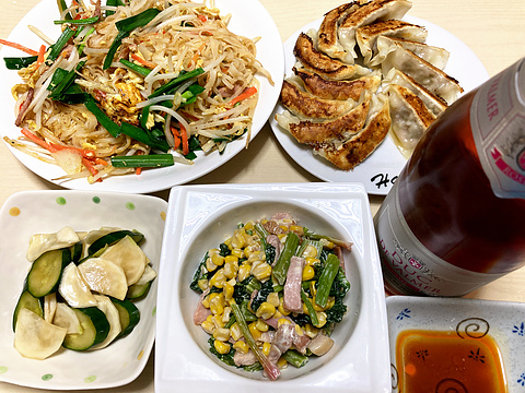 本日のメニューは、上段左からタッパイ、焼き餃子、下段左からきゅうりとかぶの浅漬け、ベーコンとほうれん草とコーンのマヨネーズ和え、です。