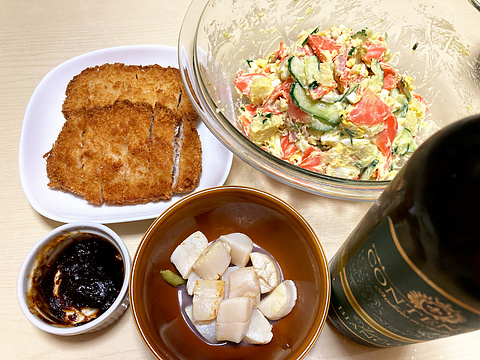本日のメニューは、上段左から味噌かつ、ポテトサラダ、下段があぶりホタテ、です。