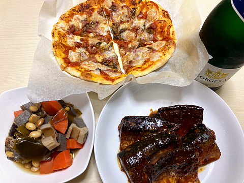 本日のメニューは、上段が自家製トマトソースピザ、下段左から五目豆、サバの味噌煮、です。