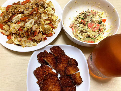 本日のメニューは、上段左から海鮮焼きそば、いわし入りポテトサラダ、下段が自家製チキンカツ、です。