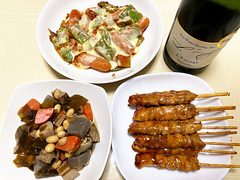本日のメニューは、上段がソーセージとモロッコインゲンのトマトチーズ焼き、下段左から五目豆、焼き鳥、です。