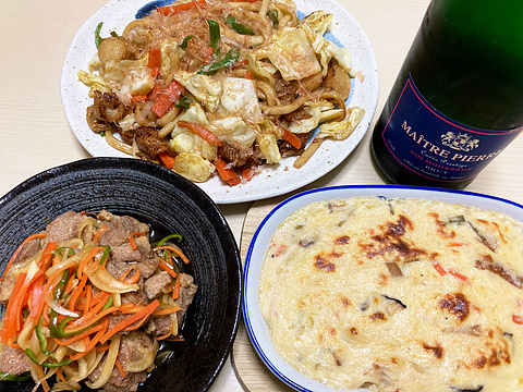 本日のメニューは、上段が焼きうどん、下段左から豚肉の南蛮漬け、おからグラタン、です。