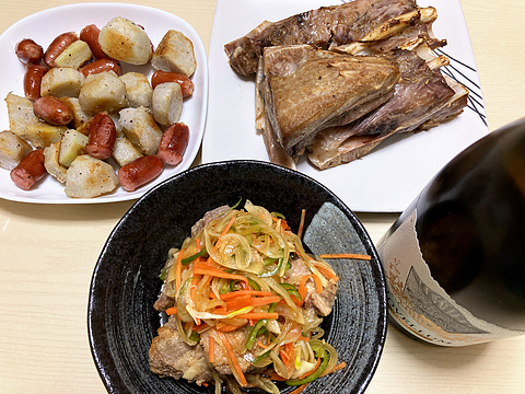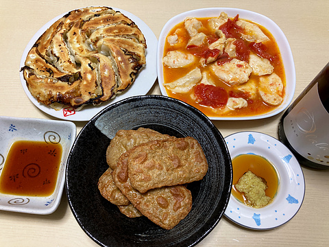 本日のメニューは、上段左から焼き餃子(市販品を焼いたもの)、鶏胸肉のトマト煮、下段がじゃこ天(市販品を焼いたもの)、です。