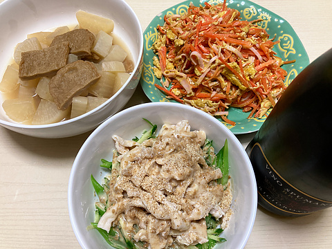 本日のメニューは、上段左からじゃこ天と大根の煮物、にんじんしりしり、下段が鶏皮とモロッコインゲンのごまドレッシング和え、です。