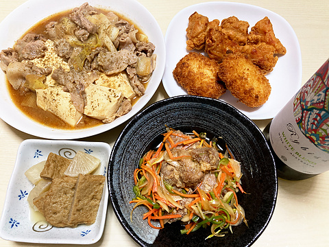 本日のメニューは、上段左から肉豆腐、鶏から揚げと海老カツ(冷凍品を揚げた物)、下段左からじゃこ天と大根の煮物、豚肉の南蛮漬け、です。