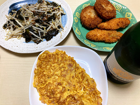本日のメニューは、上段左からワカメともやしの梅炒め、コロッケと白身魚フライ(市販品を揚げたもの)、下段が生ハムオムレツ、です。