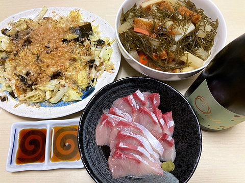 本日のメニューは、上段左からアサリとワカメの梅焼きそば、さつま揚げと昆布と根菜の煮物、下段がブリの刺身、です。