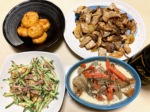 本日のメニューは、上段左からチキンナゲット(市販品を焼いたもの)、サメの塩麹漬けとヒラタケとネギのソテー、下段左から焼き豚ときゅうりのシーザーサラダ、さつま揚げと昆布と根菜のごま煮、です。