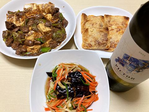本日のメニューは、上段左から鶏レバー豆腐、薄揚げのキムチーズ焼き、下段がナスの南蛮漬け、です。
