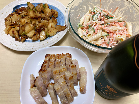本日のメニューは、上段左から鶏皮とかぶのバターオイスターソース炒め、ペンネのサラダ、下段が豚バラの塩麹漬け焼き、です。