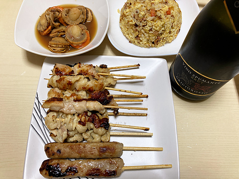 本日のメニューは、上段左からホタテの煮付け、めんまチャーハン、下段が焼き鳥各種(市販品を焼いたもの)、です。