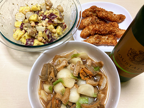 本日のメニューは、上段左からさつまいもと菊芋と豆のサラダ、鶏のクリスピーバー(市販品を揚げたもの)、下段がホタテとかぶの煮物、です。