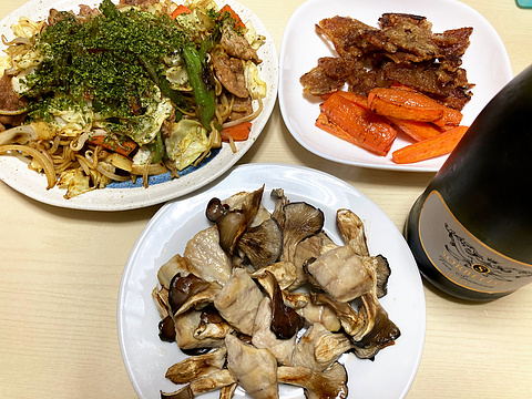 本日のメニューは、上段左からソース焼きそば、豚皮のカリカリ焼き、下段がサメの塩麹漬けとヒラタケのオーブン焼き、です。