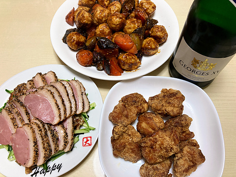 本日のメニューは、上段が鶏団子とナスのみそ炒め、下段左から鴨のパストラミ(市販品)、鶏のから揚げ(市販品を揚げたもの)、です。