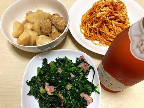 本日のメニューは、上段左から鶏団子じゃが、ポモドーロ、下段が鴨とほうれん草のバターソテー、です。