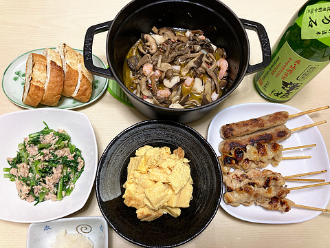本日のメニューは、上段が海鮮ときのこの塩辛アヒージョ&パン添え、下段左から春菊の自家製ツナ和え、玉子焼きの切り落とし、焼き鳥各種(市販品を焼いたもの)、です。
