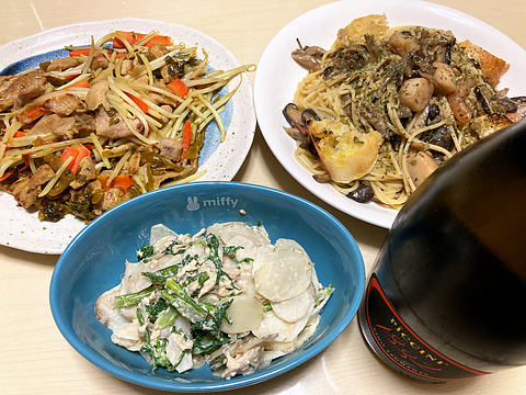 本日のメニューは、上段左から豚肉ともやしの高菜漬け炒め、海鮮ときのこの塩辛アヒージョパスタ、下段が春菊と菊芋の自家製ツナサラダ、です。