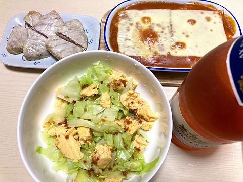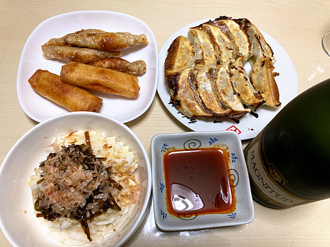 本日のメニューは、上段左から海老チリ春巻きと鶏皮餃子(市販品を揚げたもの)、焼き餃子、下段が長芋の自家製佃煮昆布和え、です。
