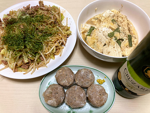 本日のメニューは、上段左からソース焼きそば、豆腐とインゲンの玉子とじ、下段がシュウマイ(市販品)、です。
