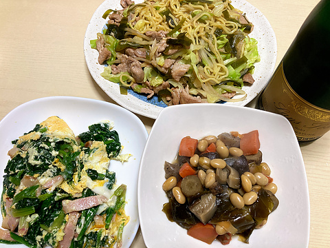 本日のメニューは、上段が昆布焼きそば、下段左から縮みほうれん草とベーコンの玉子炒め、五目豆、です。
