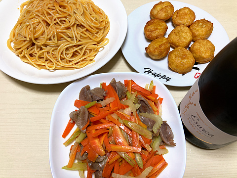 本日のメニューは、上段左からズワイガニのトマトクリームパスタ、チキンナゲット(市販品を揚げたもの)、下段が砂肝とセロリとにんじんのレモン塩炒め、です。