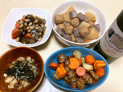 本日のメニューは、上段左から五目豆、肉団子とこんにゃくと大根のブイヨン煮、下段左からホタテの海苔佃煮和え、菊芋とにんじんの素揚げ、です。