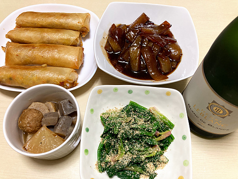 本日のメニューは、上段左から残り物春巻き、豚皮の照り煮、下段左から肉団子と大根とこんにゃくのブイヨン煮、ほうれん草のナムル、です。