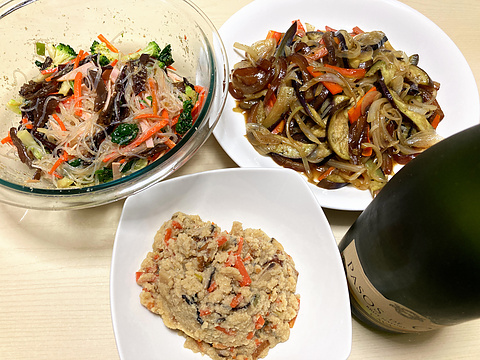本日のメニューは、上段左から春雨の中華サラダ、豚皮とナスの炒めもの、下段が卯の花、です。