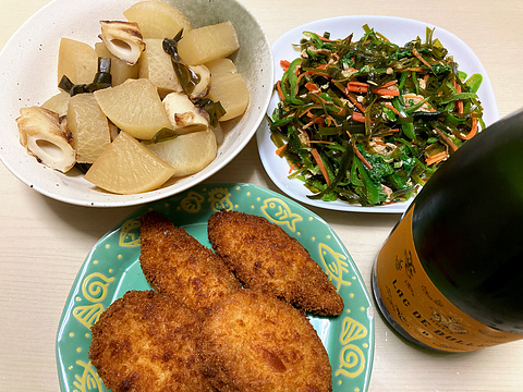 本日のメニューは、上段左から大根とちくわと昆布の煮物、昆布のツナ炒め、下段が白身魚フライとコロッケ(市販品を揚げたもの)、です。