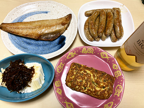 本日のメニューは、上段左から縞ほっけの干物、ハーブソーセージ、下段左から長芋の自家製昆布佃煮和え、ツナと昆布の玉子焼き、です。