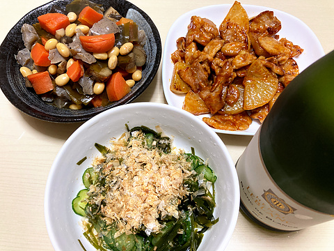 本日のメニューは、上段左から五目豆、豚肉と大根の甘辛みそ炒め、下段がきゅうりと昆布の酢の物、です。