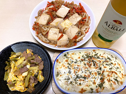 本日のメニューは、上段が切り干し大根と豆腐とレンコンの煮物、下段左から牛バラ肉と白菜の甘酢漬け、チキンドリア、です。
