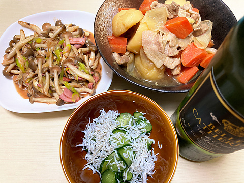 本日のメニューは、上段左からシメジの塩辛バター炒め、肉じゃが、下段がしらすときゅうりの酢の物、です。