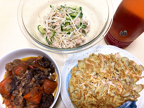 本日のメニューは、上段がもやしときゅうりと自家製ツナのナムル、下段左から牛すじとにんじんの赤ワイン煮込み、ハムと菊芋のオムレツ、です。