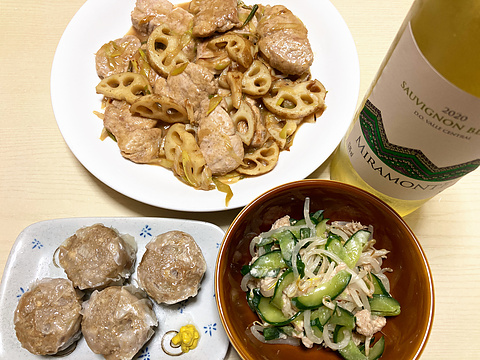 本日のメニューは、上段が豚ヒレ肉とレンコンのネギバターポン酢炒め、下段左からシュウマイ(市販品)、もやしときゅうりの自家製ツナのナムル、です。
