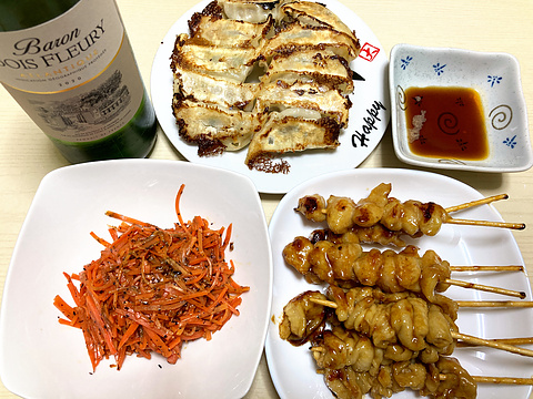 本日のメニューは、上段が焼き餃子(市販品を焼いたもの)、下段左からにんじんの梅海苔和え、鶏皮とぼんじりの焼き鳥、です。