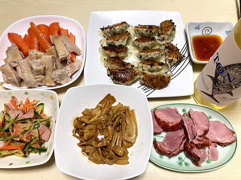 本日のメニューは、上段左から鶏の塩麹漬け焼き、手作り焼き餃子、下段左から焼き豚の中華サラダ、めんま、焼き豚、です。