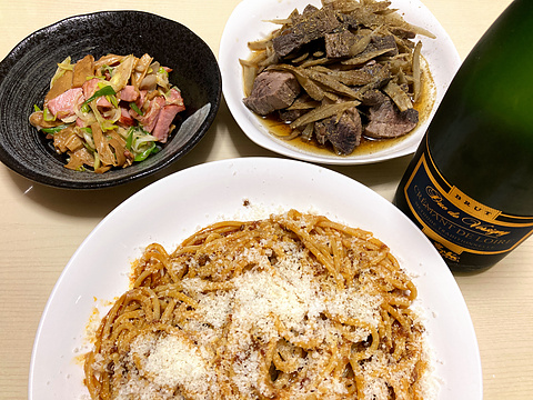 本日のメニューは、上段左からネギチャーシューめんま、マグロとごぼうのしぐれ煮、下段がボロネーゼ、です。
