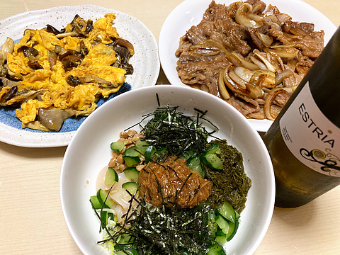 本日のメニューは、上段左からヒラタケの玉子炒め、牛バラ焼き、下段がホタテとめかぶのなめ茸納豆和え、です。