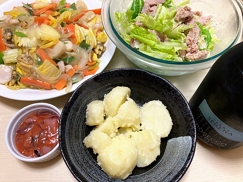 本日のメニューは、上段左から海鮮あんかけ焼きそば、低温調理自家製ツナのサラダ、下段がふかし芋の塩辛のせ、です。