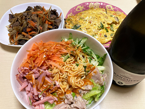 本日のメニューは、上段左からマグロきんぴら、海鮮オムレツ、下段がラーメンサラダ、です。