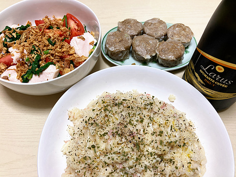 本日のメニューは、上段左からトマトと春菊と自家製サラダチキンのサラダ、シュウマイ(市販品)、下段がチーズリゾット、です。