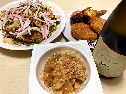 本日のメニューは、上段左からXO醤焼きそば、手羽先餃子と牛肉コロッケ(冷凍品を揚げたもの)、下段がカブのポン酢和え、です。